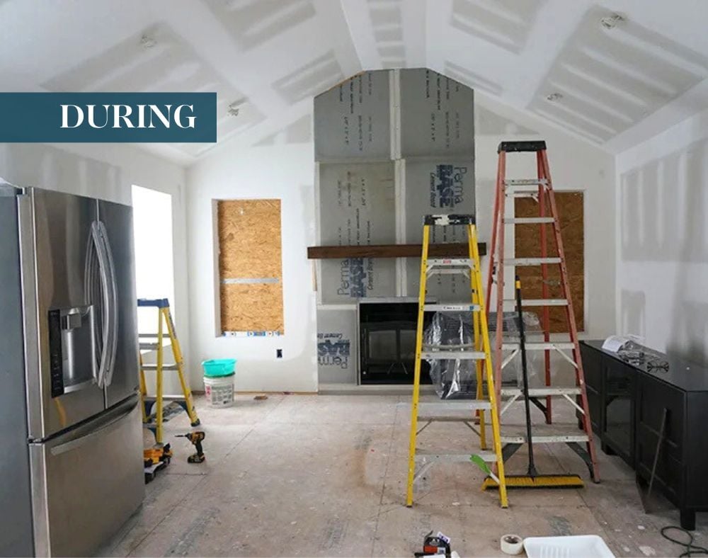 After: Bright, open design with a central island, floor-to-ceiling white cabinetry, and improved flow.