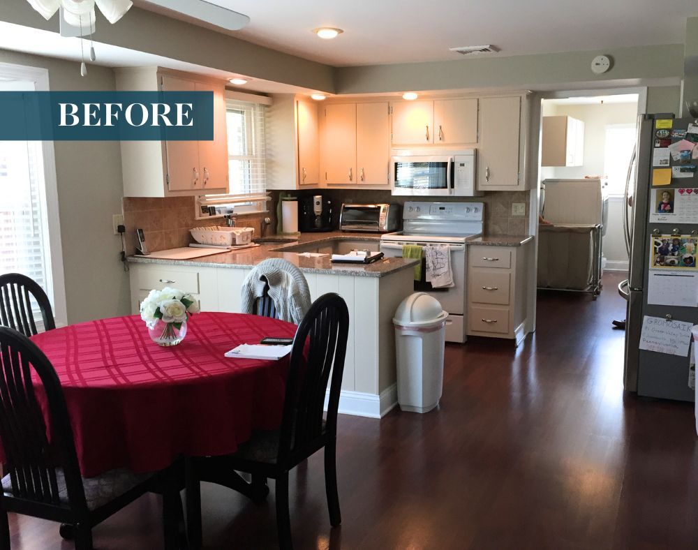 Before: Dark, dated finishes with speckled granite and a closed-off layout.
