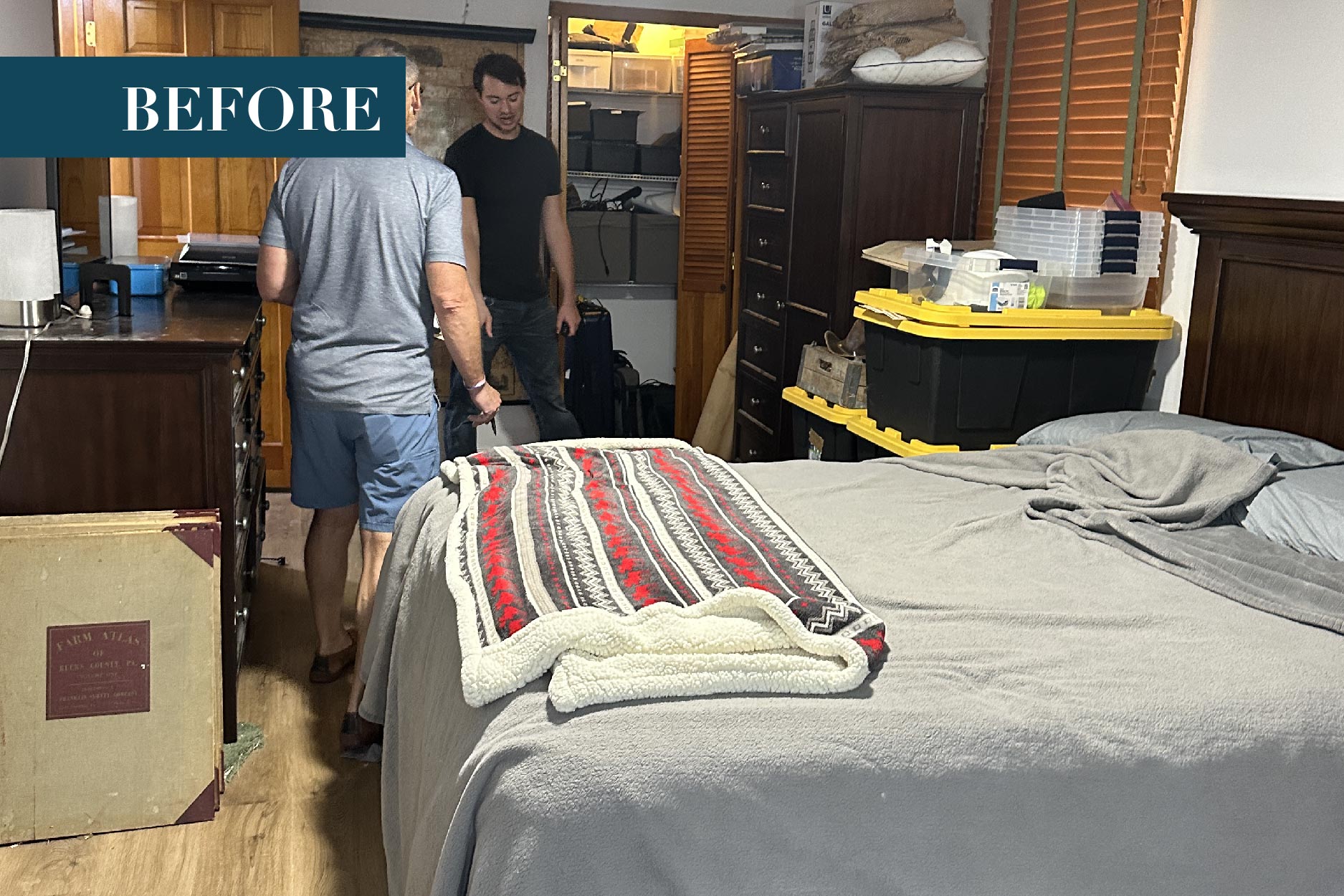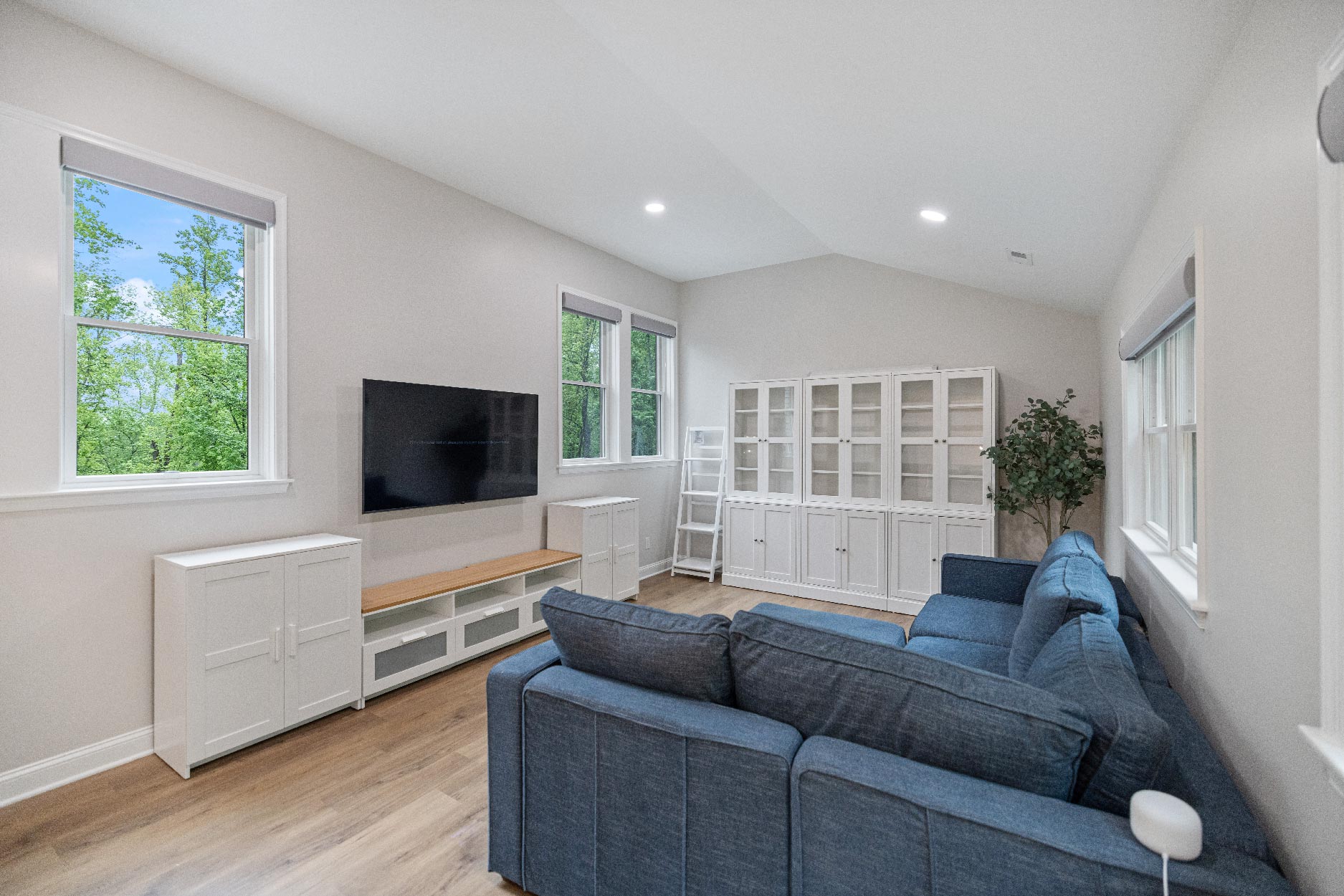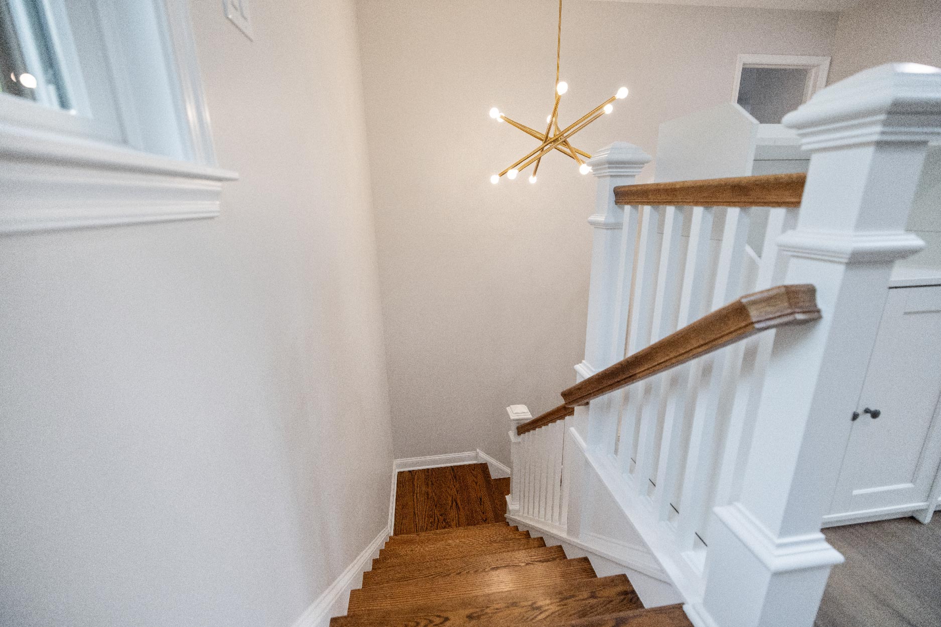 This client bought a dated ranch home sitting on a spacious property with the dream of building up to add a primary suite and lounge area. We took almost the entire roof off the home, opened up part of a bedroom to enlarge the foyer, and added a beautiful open staircase leading to the stunning second-floor great room. With a vaulted ceiling and a clerestory wall with large windows overlooking the back, this new room completely changes the feel of the home, adding a spacious and comfortable social space to a house that previously only had a small cave-like den.