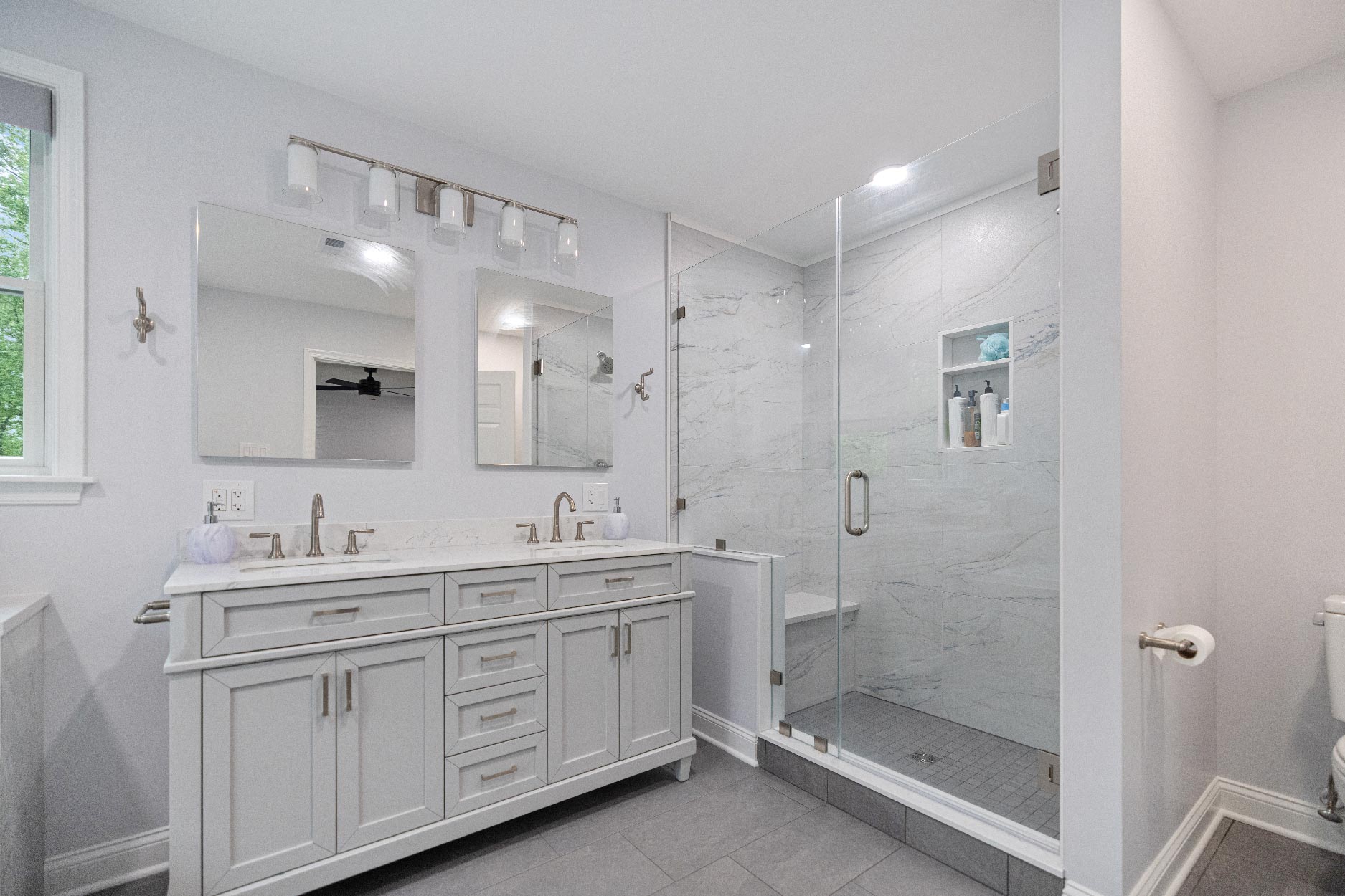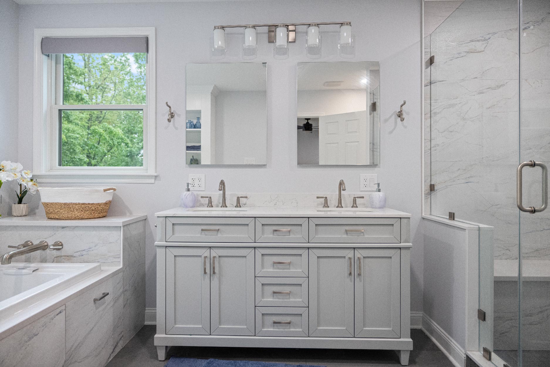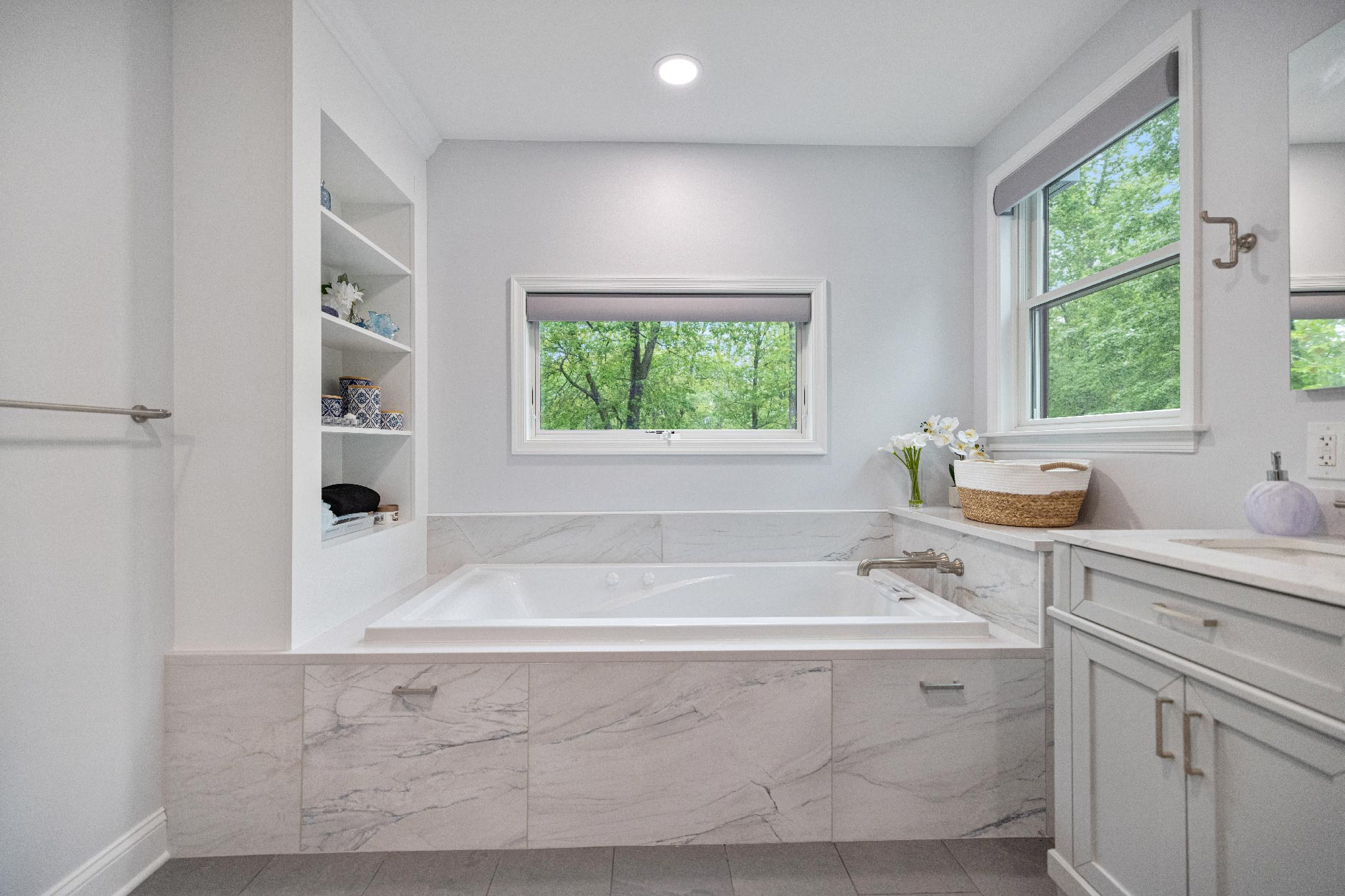 A short open hallway leads you past the stained oak stairwell and brings you to the primary suite. This generous bedroom features several large windows that let in ample natural light, as well as two large walk-in closets with custom-built-in shelving. The primary bathroom has a beautiful shower with custom shower glass, a 5-foot-wide double vanity, and a large, jetted tub that centers on a picture window overlooking the lovely backyard. We also extended the front porch the full length of the home and finished the exterior by replacing all of the aging roofing and siding.