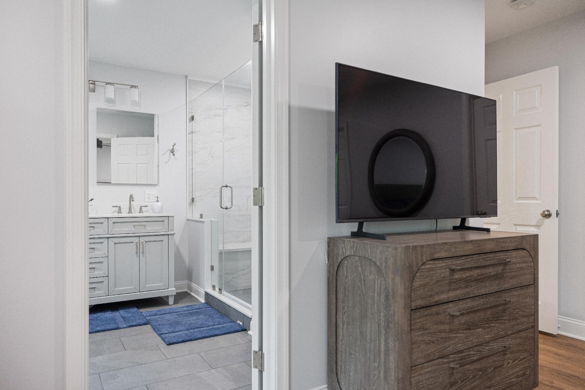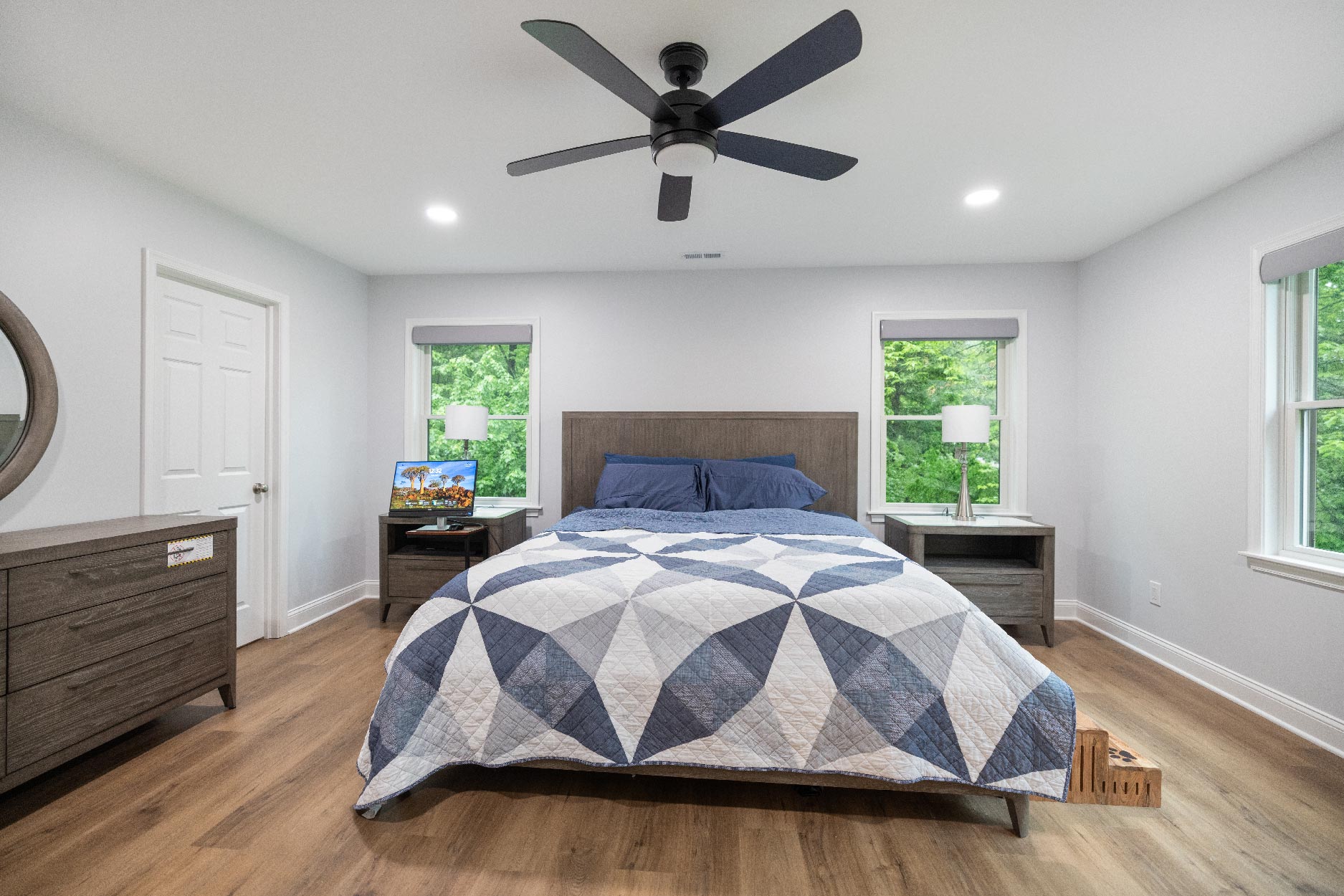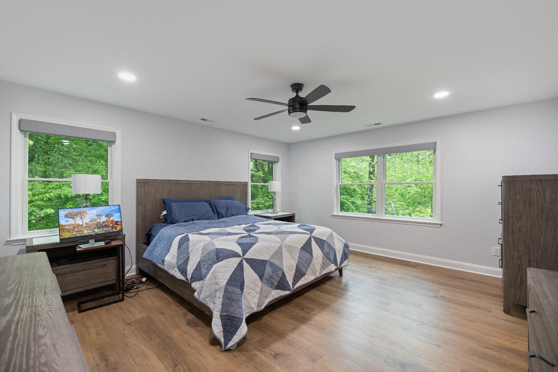 A short open hallway leads you past the stained oak stairwell and brings you to the primary suite. This generous bedroom features several large windows that let in ample natural light, as well as two large walk-in closets with custom-built-in shelving. The primary bathroom has a beautiful shower with custom shower glass, a 5-foot-wide double vanity, and a large, jetted tub that centers on a picture window overlooking the lovely backyard. We also extended the front porch the full length of the home and finished the exterior by replacing all of the aging roofing and siding.
