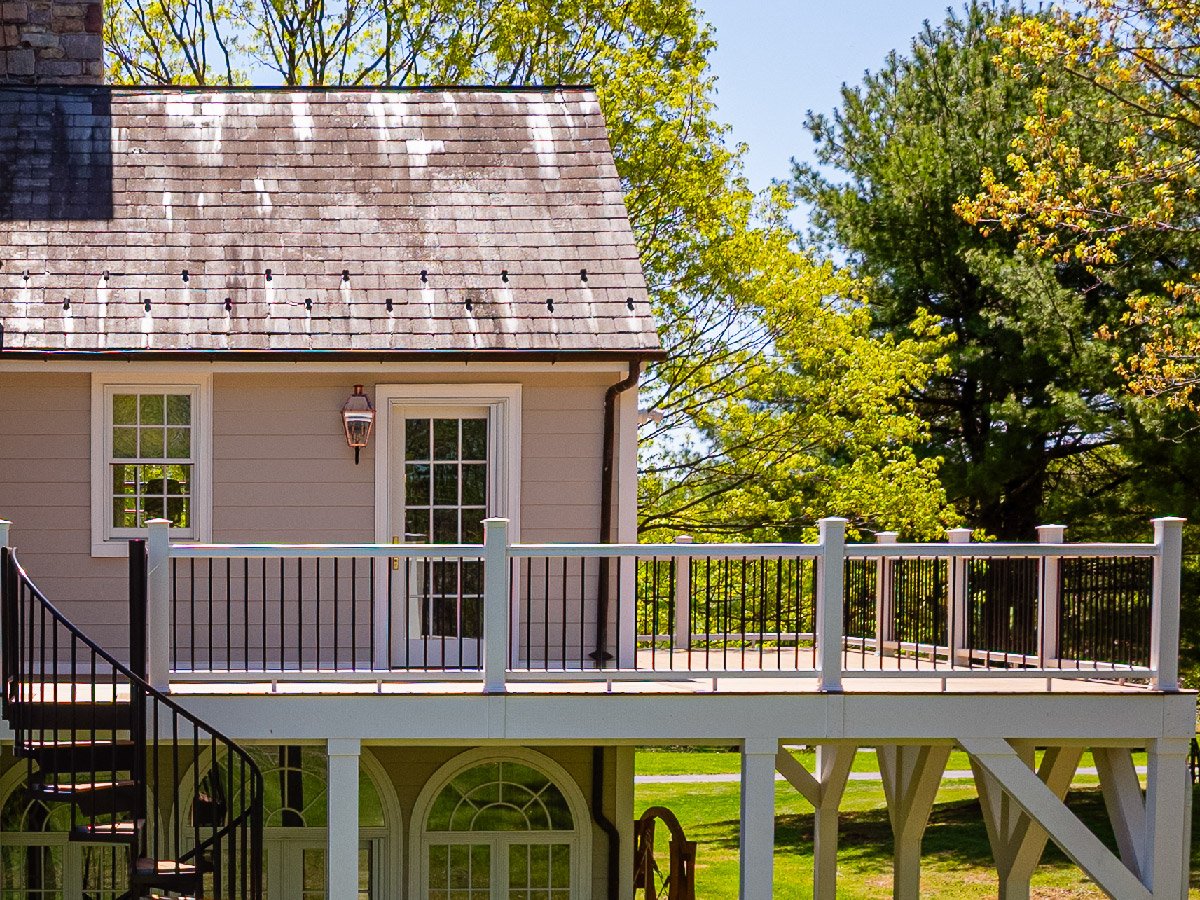 In the course of this project, we also added a large second-story wrap-around deck off their primary suite and exercise room, with a bluestone patio beneath in an ashlar pattern, and a spiral staircase connecting the two. The customer plans to install a barrel sauna on their new deck and a hot tub on the patio beneath to dramatically upgrade their wellness routine and quality of life. In all, we maintained the "Bucks County Traditional" look and feel of the home and upgraded to a finish that will last generations. This was an amazing transformation, and the best part: no more woodpeckers!