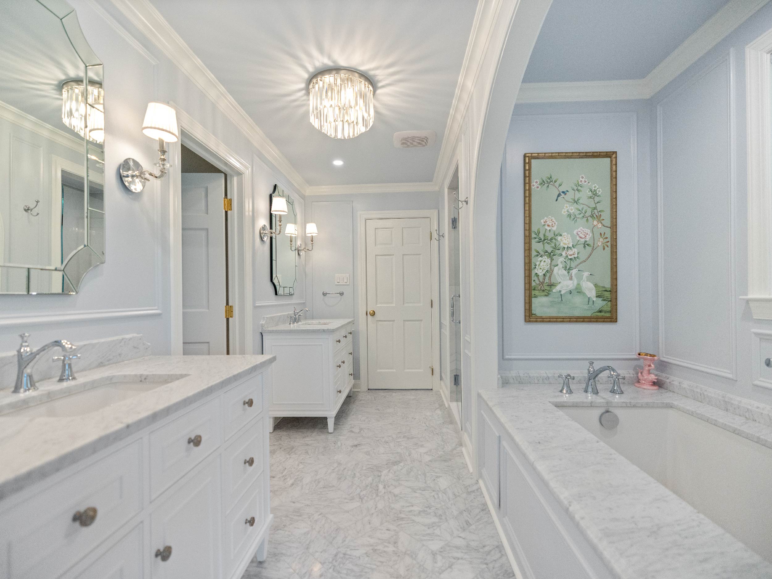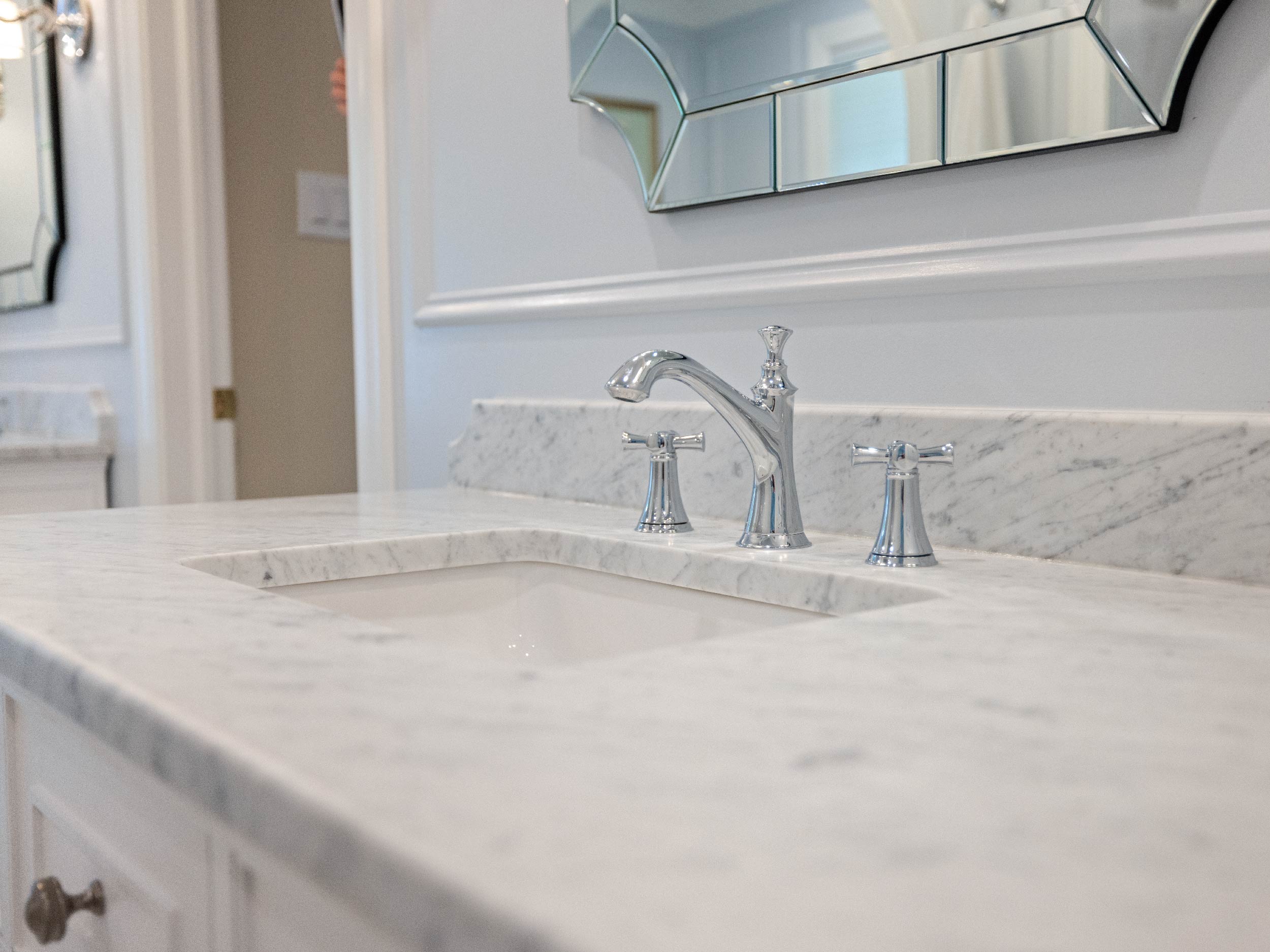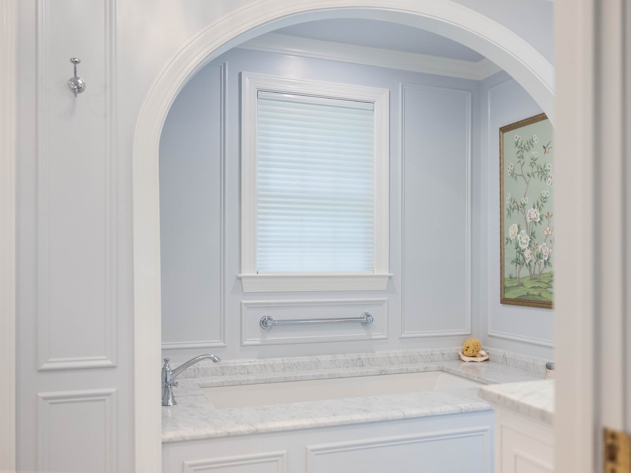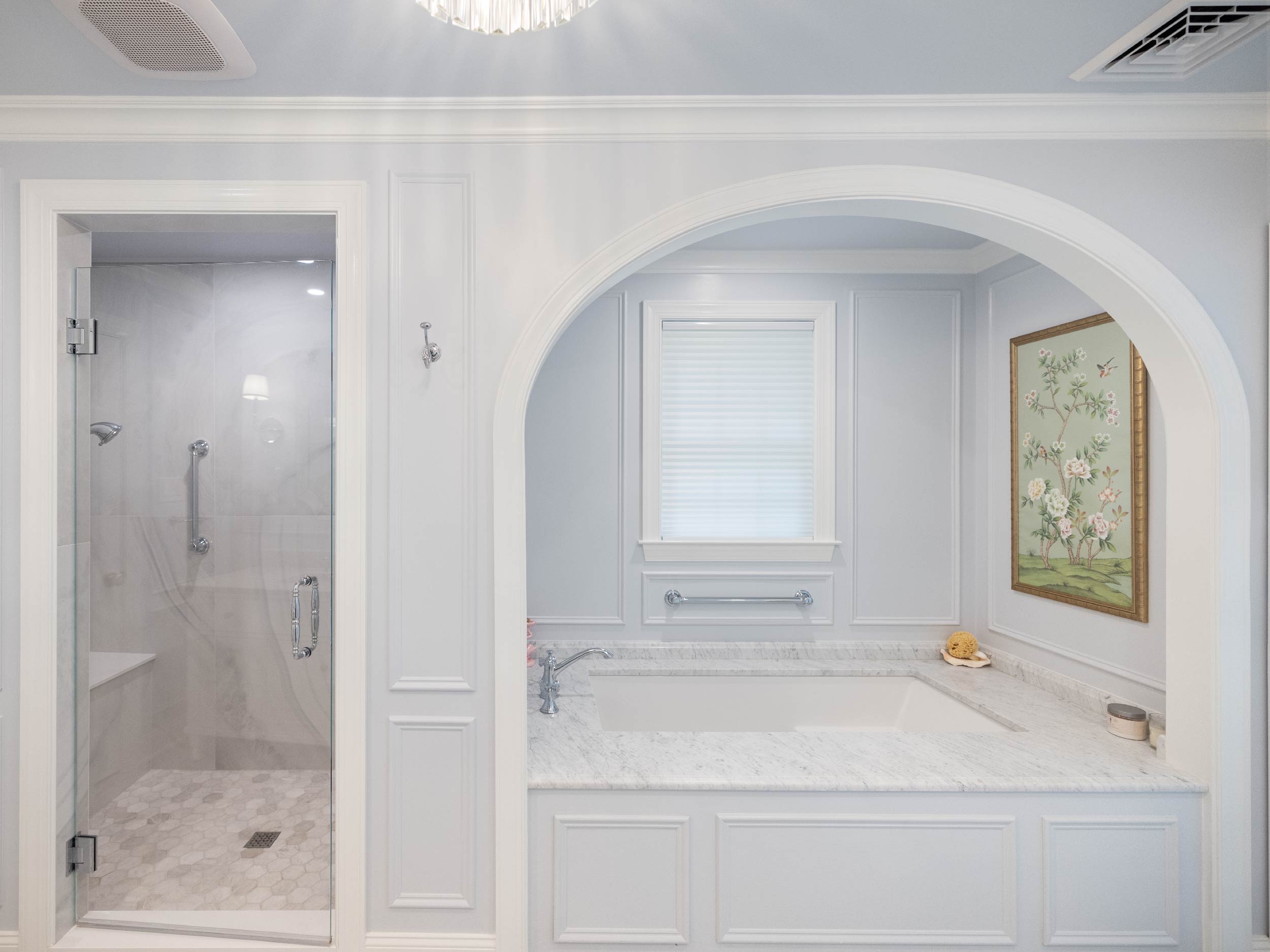 This Abington couple trusted us with their long-held desire to take the wasted space from their very large primary bedroom and redesign it into the primary suite of their dreams. Their upsized primary bathroom now features marble floors and vanity tops, wainscotting, a lovely chandelier, and a private water closet. Whether soaking in the arched tub nook or taking a luxurious shower, the fixtures and finishes are stunning. This bathroom is truly elegance defined.