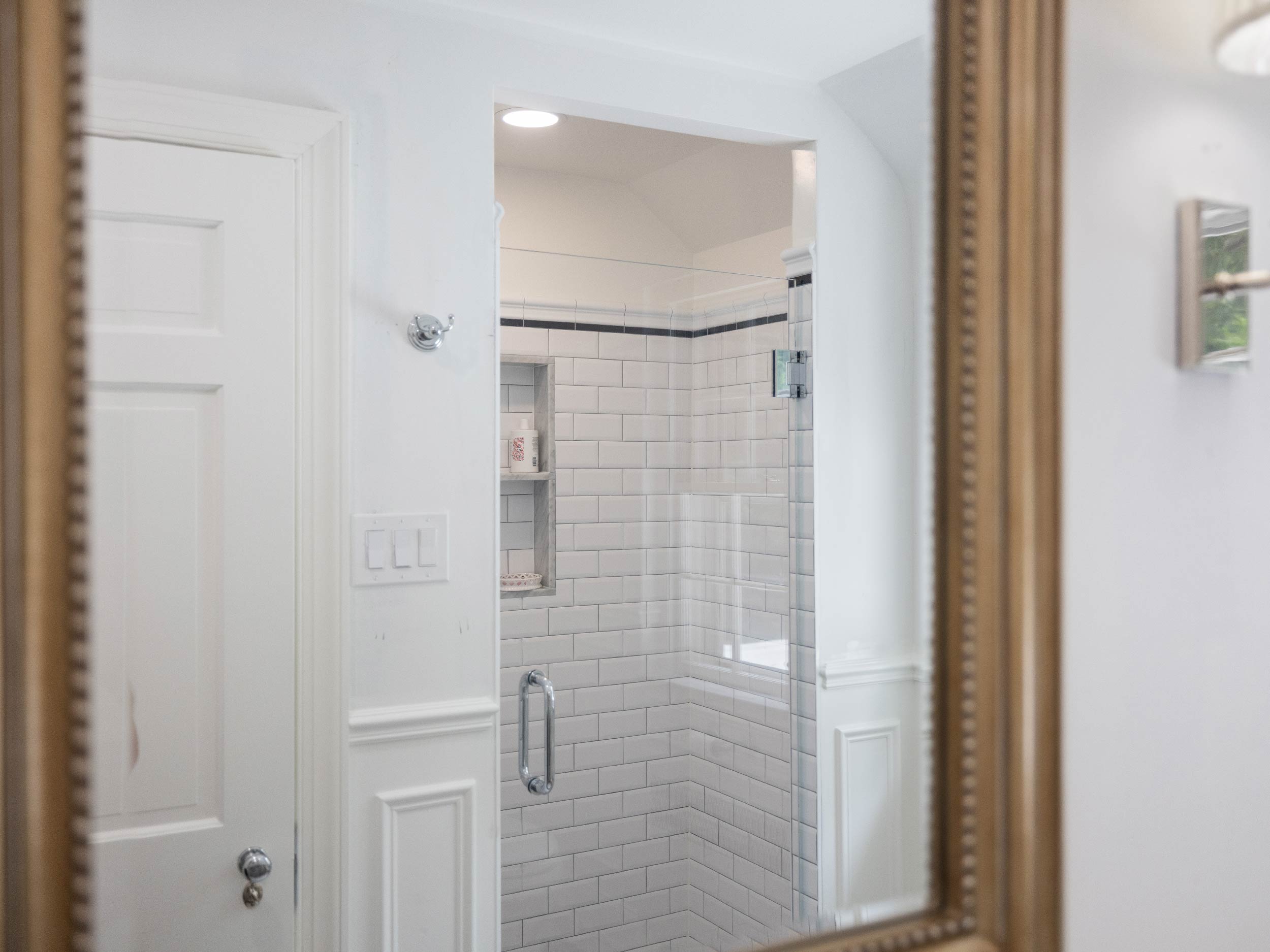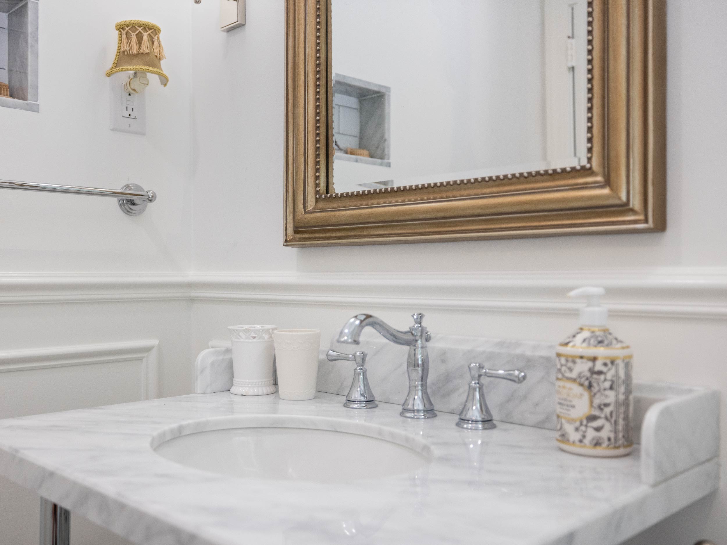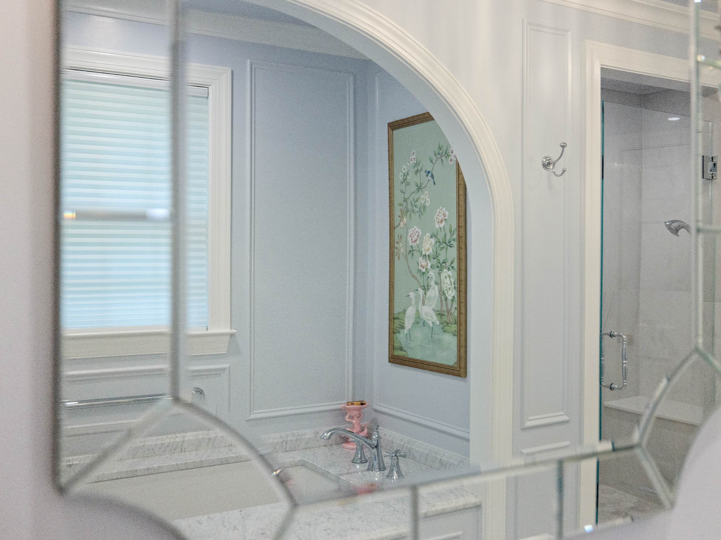 This Abington couple trusted us with their long-held desire to take the wasted space from their very large primary bedroom and redesign it into the primary suite of their dreams. Their upsized primary bathroom now features marble floors and vanity tops, wainscotting, a lovely chandelier, and a private water closet. Whether soaking in the arched tub nook or taking a luxurious shower, the fixtures and finishes are stunning. This bathroom is truly elegance defined.