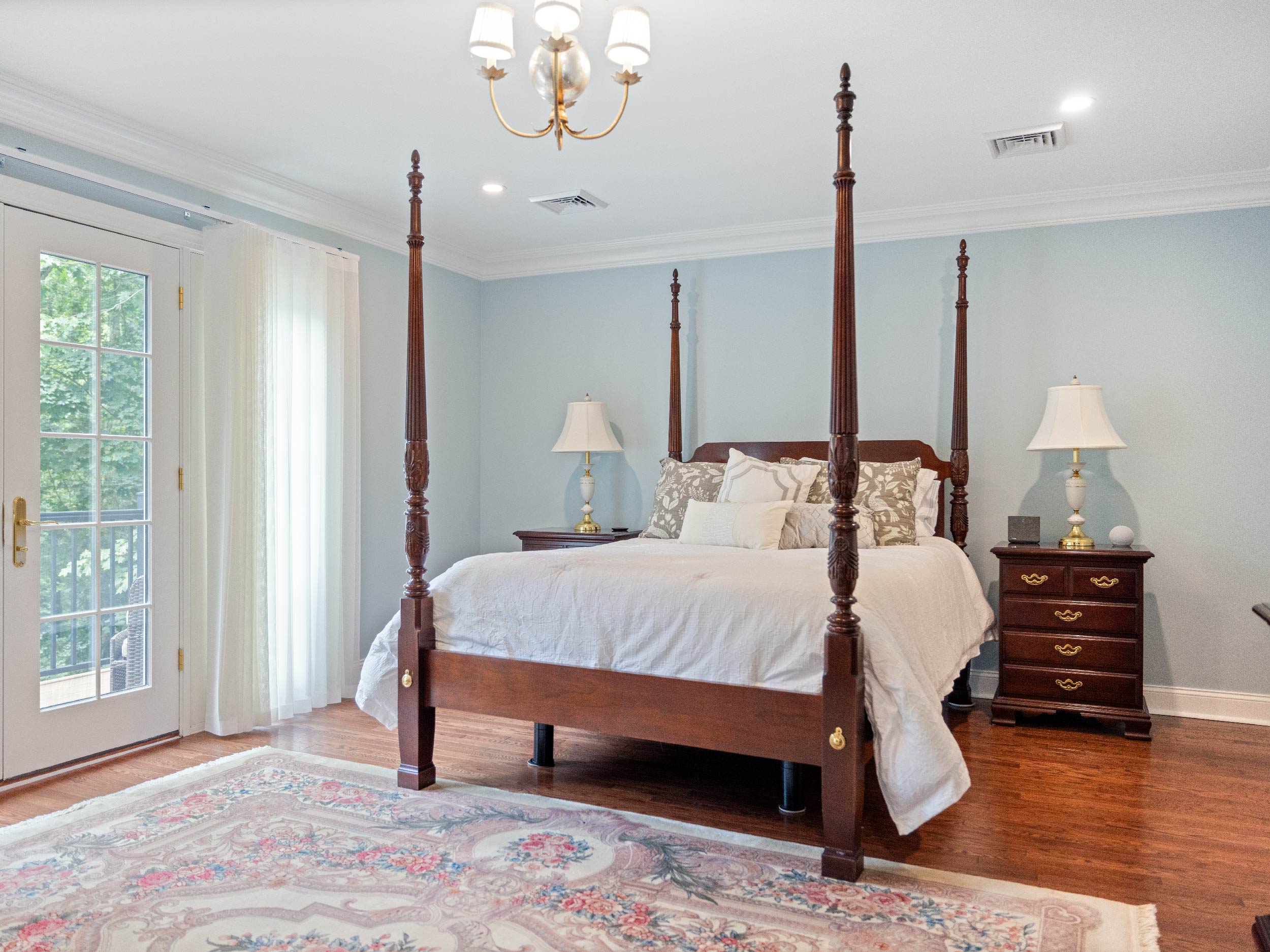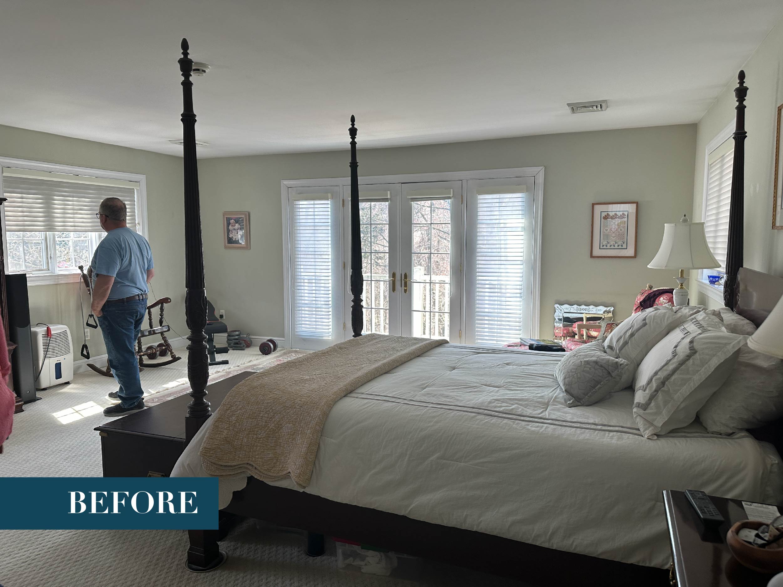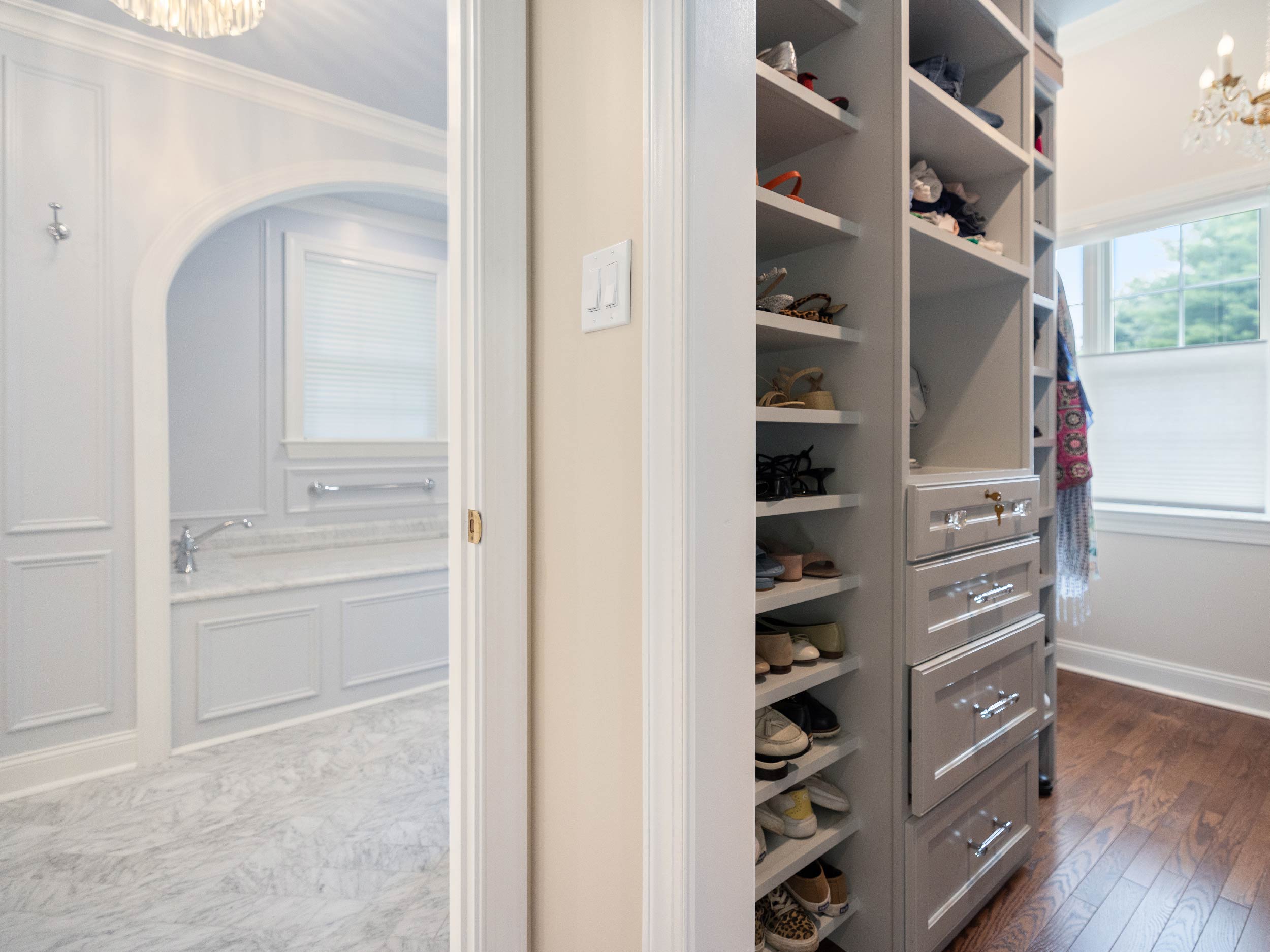 We also added a sitting balcony on the back of the bedroom, overlooking a beautiful and private backyard where they enjoy their coffee on warm mornings. His and hers closets are a must-have in a suite like this, and theirs are furnished with custom drawers and shelves that fit their space and needs. There was even enough space for a lovely little dressing table tucked away in hers!